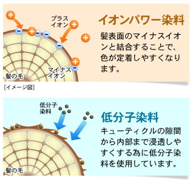 また、髪の表面のマイナスイオンに吸着する塩基性染料も使用しますが、塩基性染料はプラスイオンを帯びているため、マイナスイオンをたっぷり帯びているダメージヘアにはよく吸着します。