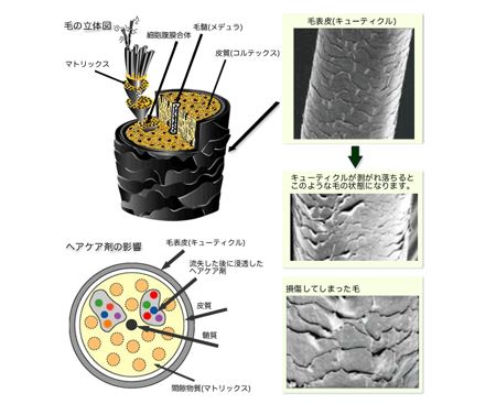 髪をしっかり染めるためには、アルカリ剤で髪のキューティクルを開いて、中のコルテックスという部分にあるメラニン色素を破壊し、その代わりに染料を入り込ませます。