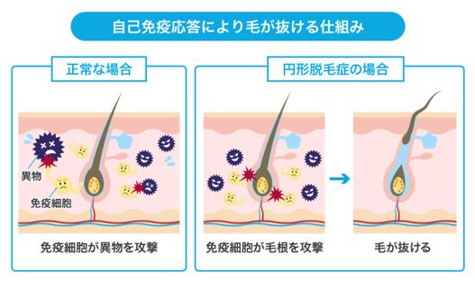 異物が侵入した時には体内に抗体やリンパ球が作られますが、円形脱毛症はリンパ球が毛穴の奥にある毛根を攻撃し、髪の毛を作る毛母細胞を破壊してしまうことで起こると考えられています。